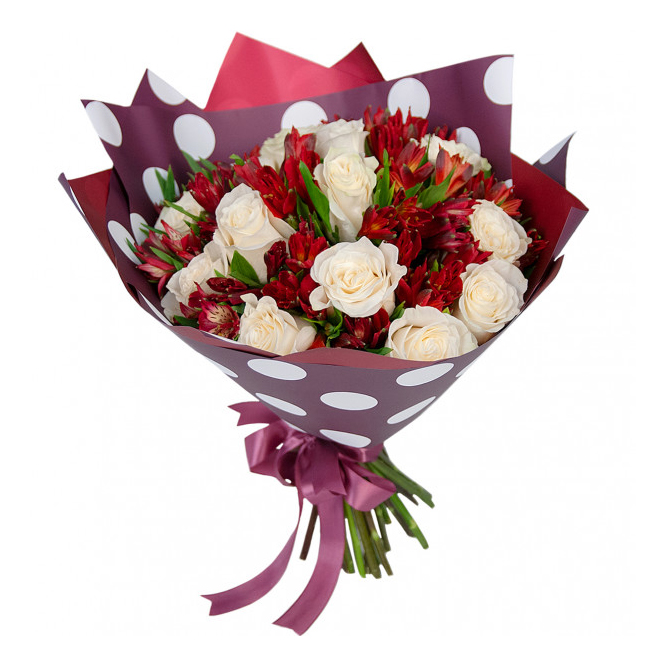Контрастный букет сочетает нежные белые розы и яркие красные альстромерии. Идеальный подарок для выражения искренних чувств. Букет с доставкой на дом в Багратионовске.