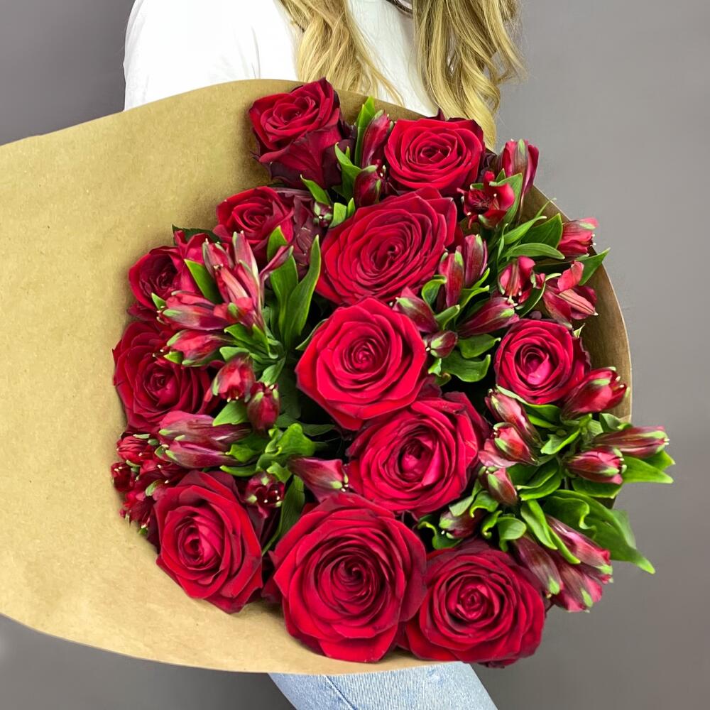 Элегантная композиция из 13 роскошных красных роз и 8 нежных альстромерий — идеальное сочетание страсти и преданности.