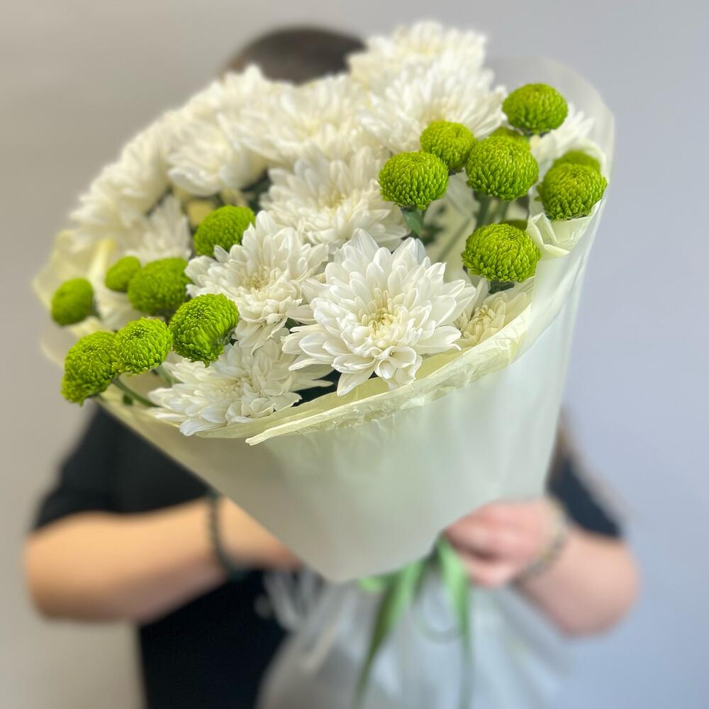 Уникальная композиция из белоснежных кустовых хризантем и редких зеленых «Филин Грин» — воплощение свежести и элегантности. Идеальный выбор для ценителей необычных цветочных решений. Букет цветов с доставкой Багратионовск.